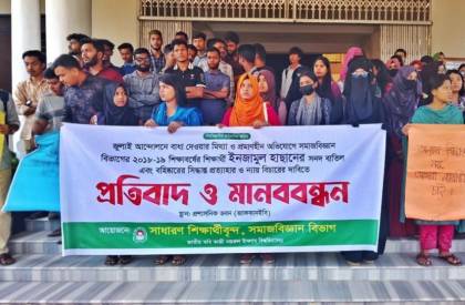 বৃহস্পতিবার (৪ ডিসেম্বর) বেলা ১১টার দিকে সমাজবিজ্ঞান বিভাগের শিক্ষার্থীরা প্রশাসনিক ভবনের সামনে এ মানববন্ধন কর্মসূচি আয়োজন করে।