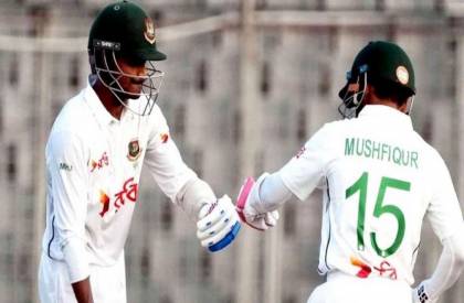 এরপর ব্যাটিংয়ে এসে ওয়ানডে মেজাজে ব্যাট চালাতে থাকেন মুশফিকুর রহিম। এতে ১০০ রানের কোটা পার করে বাংলাদেশ। ২৬ বলে ৩১ রান করে মুশফিক এবং ৮০ বলে ৩৮ রানে অপরাজিত থেকে দ্বিতীয় দিনের খেলা শেষ করেছেন জয়।
